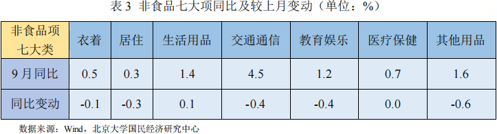 非食品项中,从同比看,9月非食品价格上涨1.5%,较上月回落0.2个百分点,影响CPI上涨约1.21个百分点。具体而言,受燃油价格回落带动,工业消费品价格上涨2.6%,较上月继续回落;受疫情散发影响,服务价格上涨0.5 %,较上月回落0.2%。
