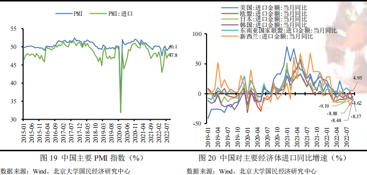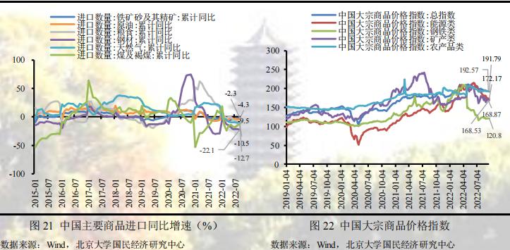 进口方面:预计进口增速在短期内或位于低位。一方面,随着国内出口下行,由出口带来的生产原料及中间品的进口需求逐渐下降,不利于进口增速;另一方面,全球经济下行叠加流动性进一步收紧,大宗商品价格呈现回落态势,预计价格因素对进口增速的贡献将进一步削弱。