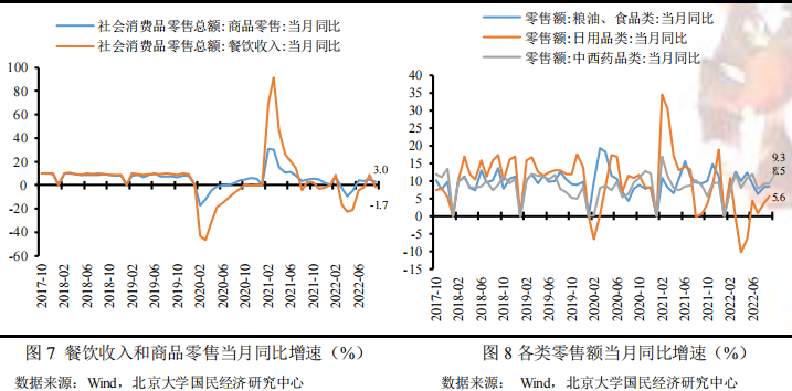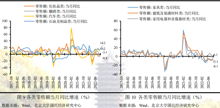 低基数效应消退叠加疫情反复是导致9月社会消费品零售总额同比增速不及市场预期的主要原因。在各地密集出台若干措施促进汽车消费的背景下,本月汽车消费增速仍然保持在较高的水平上,支撑了消费增长。然而,一方面,由于去年同期疫情明显好转带动消费显著回升,低基数效应消退拉低了消费增速。另一方面,受国内疫情多点散发、局部规模性反弹的影响,本月餐饮收入同比增速再次由正转负,较上月显著下滑;同时疫情反复使得居民消费预期转弱、储蓄意愿增强,烟酒类、化妆品类、家用电器和音像器材类等可选商品的消费同比大幅下滑,进一步压低了消费增速。另外,受商品房销售持续下滑的影响,家具、建筑及装潢材料类消费仍未出现好转迹象。