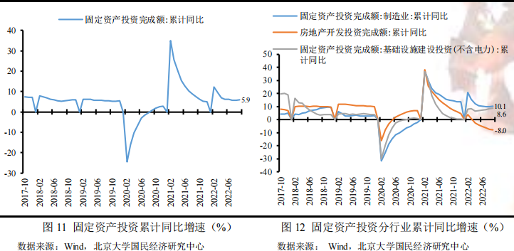 投资方面:预计四季度投资会维持稳步增长。为加力巩固经济恢复发展基础,国务院常务会议部署稳经济一揽子接续政策措施,包括增加3000亿元以上政策性开发性金融工具额度,依法用好5000多亿元专项债结存限额,持续释放贷款市场报价利率改革和传导效应、降低融资成本,核准开工一批基础设施等项目,有利于制造业及基建投资维持高增长。另外,随着保交楼专项借款政策的推出,受“断贷”事件影响被削弱的市场信心将逐步恢复,同时,9月底阶段性调整差别化住房信贷政策、人民银行决定下调首套个人住房公积金贷款利率、出售住房1年内再购房有退税优惠三条房地产利好政策接连出台也表明房地产企业中长期发展趋势向好。