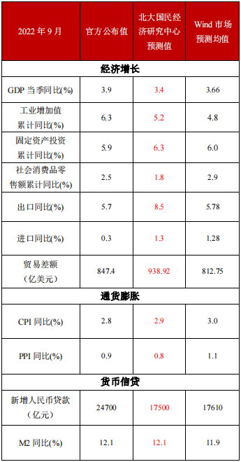 从需求端看,在各地密集出台若干措施促进汽车消费的背景下,9月汽车消费增速仍然保持在较高的水平上,支撑了消费增长,但低基数效应消退叠加疫情反复导致9月社会消费品零售总额同比增速不及市场预期,9月份社会消费品零售总额同比增长2.5%,较上期回落2.9个百分点。制造业投资加快增长叠加基建投资持续发力是投资稳中向好的主要原因,而房地产开发投资进一步走弱一定程度上拉低了投资增速。9月固定资产投资累计同比增长5.9%,较上期回升0.1个百分点,其中制造业投资同比增长10.1%,基建投资同比增长7.1%。海外整体需求逐渐收紧、国内疫情散发、极端天气影响叠加去年同期出口基数处于相对高位,使本期出口增速延续下跌趋势,9月出口3227.6亿美元,同比增长5.7%,较上期下降1.4个百分点。全球经济衰退担忧增强,同时全球通货膨胀居高不下,欧美发达国家加快推进加息缩表,全球大宗商品市场价格大幅回落,大大削弱价格因素对进口增速的支撑,9月进口2380.1亿美元,同比增长0.3%,与上期持平。
