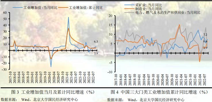 2022年9月,国内经济延续恢复发展态势,生产需求稳中有升,规模以上工业增加值同比实际增长6.3%(扣除价格因素的实际增长率),规模以上工业增加值环比增长0.84%,其中高技术制造业增长较快,同比增长9.3 %,比规模以上工业增加值快3.0个百分点,超出市场预期。1-9月,规模以上工业增加值同比增长3.9%,工业生产总体稳定增长。从三大门类看,9月份,采矿业增加值同比增长7.2%,制造业同比增长6.4%,电力、热力、燃气及水生产和供应业同比增长2.9%。9月,随着极端高温天气消退、部分地区疫情或高温限电对工业生产影响减弱及部分行业需求回暖,叠加同期低基数影响,全国规模以上工业生产加快回升,另外在政策引领基建投资增加背景下,政策性开发金融工具等政策的落实推动9月经济边际改善,叠加部分行业去年同期基数较低,提振工业生产增速。