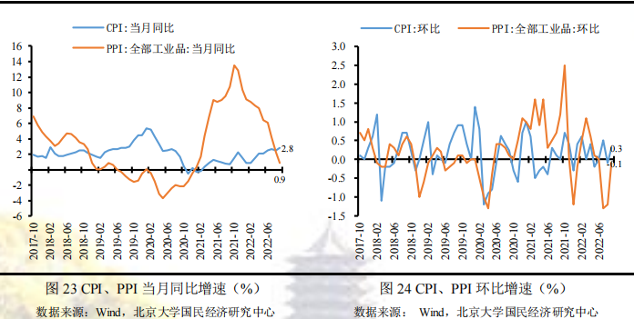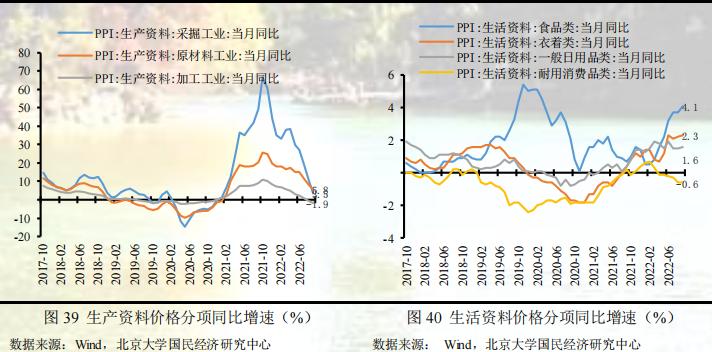 分行业,从同比看,按同比涨幅由大到小排,分别是石油加工及开采、化学原料及制品等相关行业,这些相关行业同比涨幅依旧居高,但较上月变动普遍继续回落,煤炭开采、石油开采、有色加工和黑色加工相关行业贡献了PPI同比回落的主要动力;从环比看,国际原油等大宗商品价格回落带动国内相关行业价格下降,下半年随着基建投资项目逐步实施,黑色金属、有色金属及非金属矿物等贡献了环比回弹的主要动力。