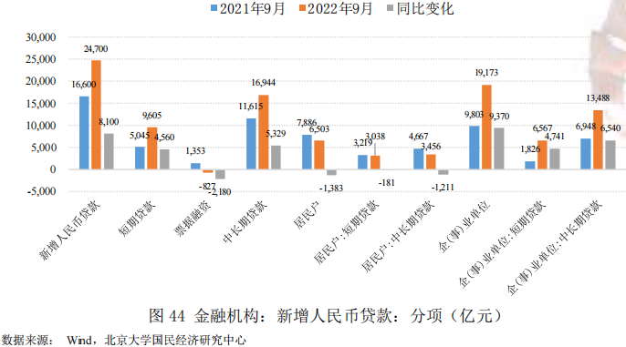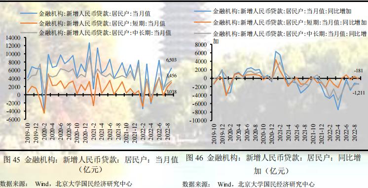 居民户贷款方面,9月居民户短期贷款3038亿元,同比少增181亿元,居民户中长期贷款3456亿元,同比少增1211亿元,表明居民户短期贷款和中长期贷款双偏弱,主要原因在于一方面近期房地产行业相关负面事件的影响,居民户购房计划推迟,另一方面疫情影响持续导致居民户消费意愿下降,以及不确定性增强引致储蓄意愿上升,共同减弱了居民户对信贷的需求。