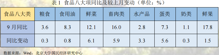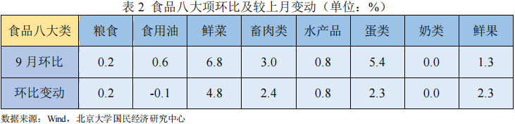CPI关注食品和非食品两个方面,食品价格由猪肉、鲜菜、鲜果和水产品等驱动,非食品价格由工业消费品和服务业价格驱动。9月份,国内疫情防控形势总体可控,消费市场供应总体充足,CPI同比上涨2.8%、环比由上月-0.1 %转为0.3%,具体而言:食品项价格环比回弹显著,其中鲜菜、畜肉和鲜果环比回弹是本月食品价格环比回弹的主要原因;非食品价格环比不变,其中工业消费品价格回弹对冲了服务价格的下行。