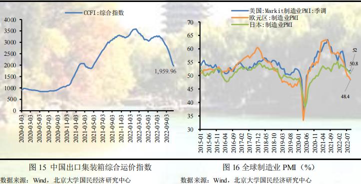 2022年9月,中国出口3227.6亿美元,同比增长5.7%,较上期下降1.4个百分比,出口增速延续下跌趋势,略低于市场预期。这主要是因为9月份欧美发达经济出现衰退迹象,海外整体需求逐渐收紧,利空中国出口。数据显示9月摩根大通全球制造业PMI录得49.8,较前值下降0.50个百分点;美国9月份制造业PMI终值录得52,欧元区9月制造业PMI终值为48.4,日本8月份制造业PMI终值为50.8,除美国PMI较前值回升0.2个百分点,欧元区和日本PMI分别较上期回落1.2个百分点和0.2个百分点。同时,全球石油价格下行,一定程度缓解欧美国家能源约束,缩小海外产需缺口,同时9月国内疫情散发和极端天气也对出口造成一定影响,叠加去年同期出口基数处于相对高位,使本期出口增速延续下跌趋势。数据显示,八大枢纽港口集装箱吞吐量增速和出口运价水平均有所回落。9月下旬八大枢纽港口集装箱吞吐量同比增加4.4%,较上一旬下降7.5个百分点。其中,外贸同比增长5.9%,较上一旬下降2.5个百分点。9月,外贸重箱吞吐量同比下降10.3%,环比下降6.4%。9月中国出口集装箱综合运价指数平均值为2593.35点,较上月平均下跌14.5%;上海出口集装箱综合指数平均值为2343.48点,较上月平均下跌32.5%。从我们的预测结果来看,出口增速低于我们的预期,这一方面是因为在进行预测时低估了去年同期高基数效应对本期出口增速的压制效应;另一方面是极端天气对9月出口造成不利影响,台风“轩岚诺”和“梅花”陆续到来,造成长三角地区港口停摆,对本月出口造成影响。