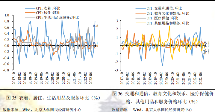 总体而言,非食品项七大类价格环比分化(2升、3降、2不变),其中衣着项环比幅度最高(+0.8%),较上月环比变动分化(3正、3负、1不变),其中交通通信项环比变动最显著(+1.1%)。