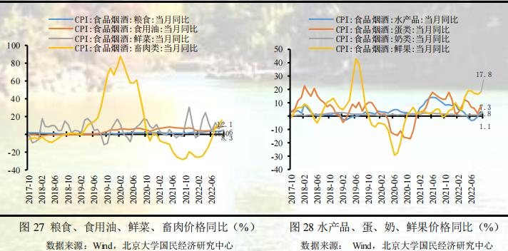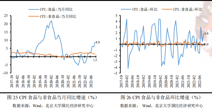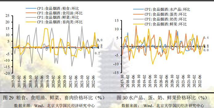 从环比看,食品价格上涨 1.9% ,较上月上升 1.4 个百分点,影响 CPI 上涨约 0.35 个百分点。受部分养殖户压栏惜售情绪回升,二次育肥下生猪出栏减少,叠加消费需求季节性走强等因素影响,猪肉价格上涨 5.4% ,较上月上升 5.0 个百分点;受前期多地持续高温天气影响,鲜菜上涨 6.8 % ,较上月上升 4.8 个百分点。