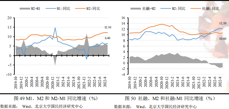 2022年9月末,狭义货币(M1)余额66.45万亿元,同比增长6.4%,较上期提高0.3个百分点;广义货币(M2)余额262.66万亿元,同比增长12.1%,较上期下降0.1个百分点。本月M2同比增速仍维持高位,一方面是由于低基数效应的作用,去年9月M2同比增速为8.3%,处于全年地位,另一方面是由于前三季度稳增长政策发力较去年提前以及新的扩张性政策仍在推出,不仅造成财政前置也扩大了财政支出力度,大量财政存款转成M2,推升M2同比增速。我们预测9月末M2同比增长12.1%,和实际值一致,主要考虑到低基数效应以及持续出台的稳增长政策效果。