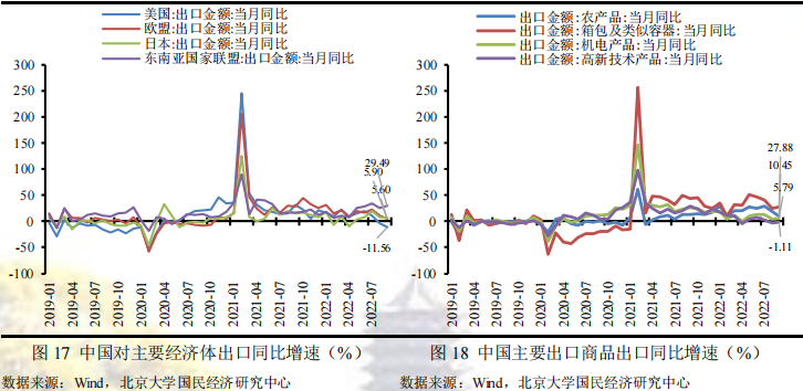 从9月份的出口国别来看,中国对欧盟、美国、东盟和日本出口的当月同比增速分别为5.60%、-11.56%、29.49%和5.90%,除对东盟国家出口增速较上月提高4.36%以外,对其他国家的增长速度均较前值有所回落,其中对美国的出口增速回落较大,除了受中国国内疫情扰动之外,主要美国经济衰退迹象显现、中美关系紧张以及欧美国家能源约束缓解有关。同时,中国对东盟的出口增速仍显著优于其他国家,RCEP持续支撑中国出口。