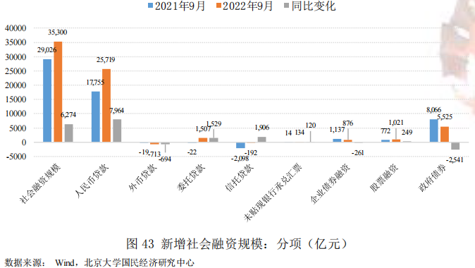 2022年9月社会融资规模3.53万亿元,较去年同期多增6274亿元,远超市场预期。其中,人民币贷款25719亿元,同比多增7964亿元,是支撑本月社融规模大幅多增的主要分项,而政府债券5525亿元,同比少增2541亿元,对本月社融规模形成较大拖累。