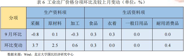 分大类,从同比看,高基数下9月PPI上涨0.9%,较上月继续回落1.4个百分点。受国际大宗商品边际回落影响,生产资料价格上涨0.6%,较上月继续回落1.8个百分点,其中采掘工业同比回落最为显著;受上游工业部门价格传导影响,生活资料价格上涨1.8%,较上月上升0.2个百分点,其中食品工业同比上升最为显著。生产资料同比回落是此次PPI同比回落的主要因素。