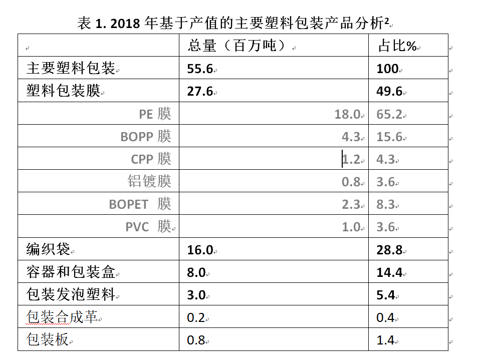 在中国,在所有的塑料包装中,包装膜几乎占50%,而在塑料包装薄膜中, PE包装膜最大,占65.2%(如表1所示)。