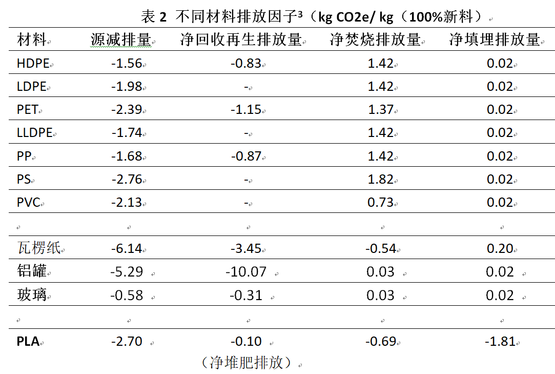 如果用聚乳酸(PLA)替代塑料,在相同包装量的重量系数下, PLA生产阶段的排放高于塑料,而在填埋处置情况下,PLA碳排放则低于塑料。