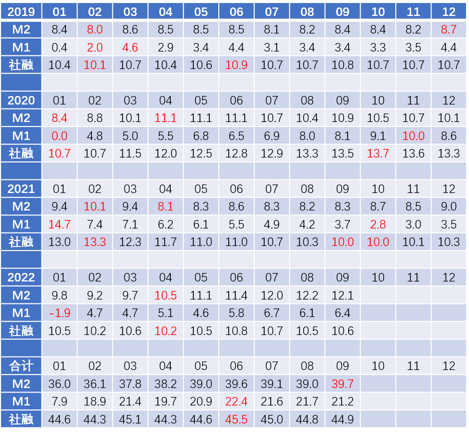 2019-2022年广义货币M2、狭义货币M1和社会融资规模(社融)各月增速变化情况见下表: