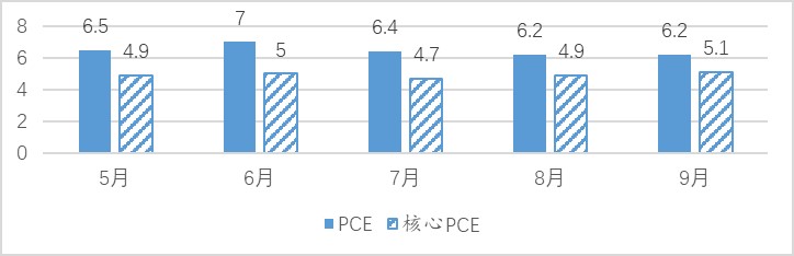 首先,通胀优先的货币政策目标不变。至少在通胀没有出现明显“软化”时,美联储会坚持控制通胀。从9月份公布通胀数据来看,CPI同比8.2%,核心CPI同比6.6%。从美联储更加看重的PCE价格数据来看,9月份同比增幅6.2%,核心PCE同比5.1%。从近5个月的PCE和核心PCE的变化来看,PCE价格显示的通胀仍在高位。同时,PCE和核心PCE之间的差距在不断缩小,7月份两者相差两个百分点,9月份只相差1个百分点(图1)。这说明供给冲击对美国通胀尽管仍然有助推作用,但需求是驱动美国通胀的主要因素。在劳动力市场失业率保持在3.5%低位的情况下,美联储具备持续紧缩控通胀的基础。