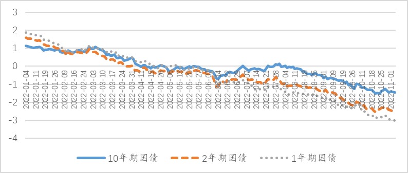 从中美国债市场收益率倒挂来看,由于美联储从今年3月份开始加息,4月份开始2年期和1年期中美国债收益率开始出现倒挂,随后随着美联储持续激进加息,两者利差倒挂也逐步扩大。截至11月3日,2年期和1年期中美国债收益率之差分别倒挂了约262个BP和303BP。中美10年期国债收益率从8月初以来出现了持续倒挂,截至11月3日,10年期中美国债收益率之差倒挂了约146个BP(图2)。