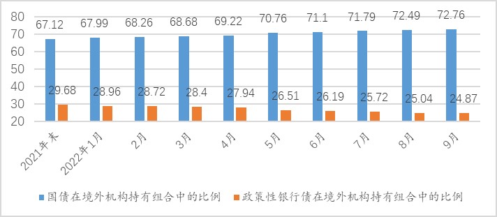 今年以来,在美联储激进加息导致中美政策性利差、国债市场收益率倒挂,以及人民币兑美元贬值的背景下,短期套利因素带来银行间债券市场外资一定的资本流出,但中国国债在境外机构持有债券组合中的占比出现了近6个百分点的上升,这说明中国国债成为境外机构投资的重要品种,保持人民币流动性成为境外机构管理资产需要考虑的重要因素,表明了中国国债市场发挥着中国金融资产市场稳定器的作用。