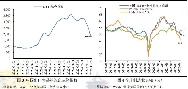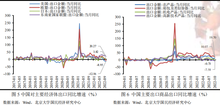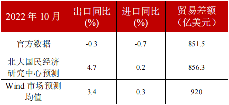 2022年10月,中国出口2983.7亿美元,同比下降0.3%,较上期下降6个百分点,出口增速大幅下降,低于市场预期。这主要是因为10月份全球经济增长放缓,发达经济体货币政策不断紧缩,海外需求总额进一步收紧,对中国出口产生不利影响。数据显示,10月摩根大通全球制造业PMI录得49,较前值下降0.6个百分点;美国10月份制造业PMI终值录得50.4,环比下降1.6个百分点;欧元区10月制造业PMI终值为46.4,环比下降2个百分点;日本10月份制造业PMI终值为50.7,环比下降0.1个百分点。同时,10月国内局部地区疫情出现反弹,受疫情影响城市数量增加,可能对出口产生不利影响,叠加去年同期出口的高基数效应,使本期出口增速大幅下跌。数据显示,八大枢纽港口集装箱吞吐量增速和出口运价水平均有所回落。10月下旬,八大枢纽港口集装箱吞吐量同比增长3.2%,较10月中旬水平下降1.5个百分点,其中外贸箱吞吐量同比增长1.2%,较中旬增长1.1个百分点。10月,中国出口集装箱综合运价指数平均值为1949.49点,较上月平均下跌24.8%;上海出口集装箱综合指数平均值为1763.45点,较上月平均下跌24.8%。从我们的预测结果来看,出口增速回落符合我们的预期,但回落幅度超出预期,这主要是由于低估了海外需求总额收缩对出口的影响。