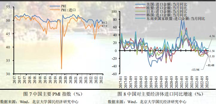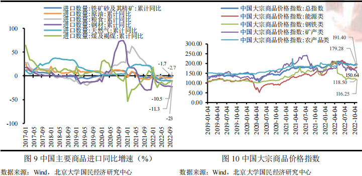 进口方面,预计进口增速在短期内或保持低位。一方面,随着出口下行压力增大,由出口带来的生产原料及中间品的进口需求进一步下降,不利于进口增速;另一方面,全球经济情势处于下行,通货膨胀居高不下,各发达国家货币政策持续收紧,大宗商品价格呈现回落态势,预计未来价格因素对进口增速的贡献将逐渐削弱。
