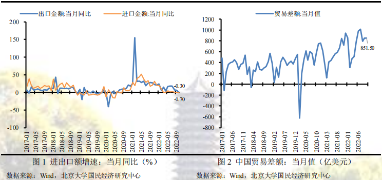2022年10月,按美元计价,中国进出口总值5115.9亿美元,同比下降0.4%。其中,出口2983.7亿美元,同比下降0.3%;进口2132.2亿美元,同比下降0.7%;贸易顺差851.5亿美元,扩大0.9%。总体来看,10月份出口增速延续前两个月的下跌趋势,低于市场预期,进出口增速均由正转负。出口方面,受通货膨胀居高不下影响,发达经济体持续采取紧缩货币政策,全球经济衰退风险增强,海外总需求进一步收紧,加之去年同期高基数效应的压制作用,10月出口增速大幅回落,较上月下降6个百分点。进口方面,10月疫情散点式暴发,影响国内生产消费需求,同时出口需求紧缩也带来进口需求逐渐回落,叠加大宗商品市场价格呈现回落态势,削弱价格因素对进口增速的支撑作用进一步削弱,10月进口增速有所回落,较上月下降1个百分点,弱于市场预期。