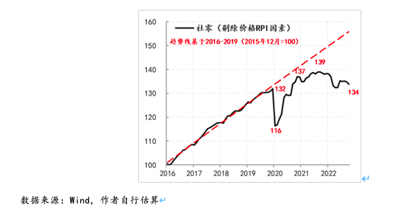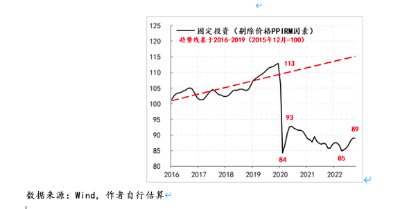 为了尽可能观测经济缺口再度扩大的程度,我们分别观察了剔除物价因素后的消费与投资的实际情况。例如,剔除价格因素(价格指标我们选取的是商品零售价格RPI),以2015年底数据为基数100,相应2019年底消费为132,而在2020年春节前后疫情冲击下,消费曾一度跌至116,之后进入修复,2020年底已修复至137,基本接近2016-2019年趋势线水平,但之后修复进程放慢,直至2021年三季度仅修复至139,但距离趋势线水平距离有所扩大,之后缺口快速扩大,截至2022年10月,消费仅为134,几乎与2019年底的水平持平,即过去三年间,剔除价格因素之后,消费近乎零增长,较2016-2019年趋势线水平存在15%的缺口。