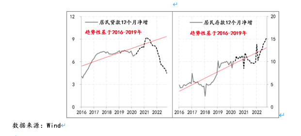 自2021年二季度以来,中国家庭部门的债务融资速度开始呈现趋势性下降,2021年3月末家庭部门债务融资速度为9.22万亿/年,至2022年10月末已降至4.5万亿/年,19个月间累计下降了4.7万亿,平均每月下降了2500亿;5个月后,家庭部门的存款则开始呈现趋势性上升,2021年8月末,家庭居民存款增速为9.72万亿/年,至2022年10月末已升至15.3万亿/年,14个月间累计上升了5.6万亿,平均每月上升4000亿。