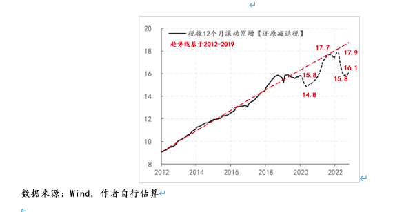 除了直接观察消费和投资的缺口之外,我们还通过税收的增长情况来间接观察广义税基名义GDP的变化情况,此逻辑依据为宏观税负=税收÷GDP。鉴于2016年前后减税政策就成为重要的宏观政策,加之期间还有营改增等重大税制调整,我们相应将2012-2019年税收数据作为趋势线的数据基础,同时为了剔除疫情后额外增加的减免退税政策影响,我们按照逐月平均的方法还原了减免税因素,即将当年的减税规模平均分配到当年的12个月份。