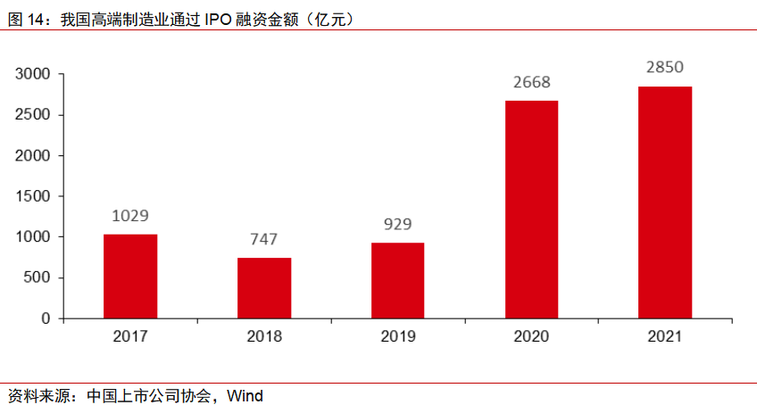 七是资本市场为高端制造业发展注入活力。资本市场资源有效配置功能为高端制造业实体经济发展注入活力。自2017年以来,共有871家高端制造业公司通过IPO进行了融资,融资金额达2850亿元。特别是科创板的设立、实行注册制简化上市程序、降低企业融资成本等一系列政策扶持,为高端制造业企业提供了更符合企业禀赋特点的上市融资方式,进一步发挥了资本市场服务实体经济的作用。