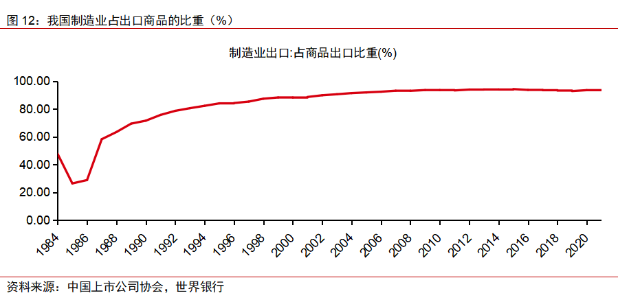 我国制造业出口占商品出口比例持续稳步提升,截至2020年达到93%,改变了轻工产品出口占据主要比例的局面,出口产品中光伏、锂电产品表现比较突出。受益于高端制造业的发展,我国出口商品机构持续改变,以电子、电力设备、乘用车及零部件、机械制造为代表的高端制造产品比重持续提升。