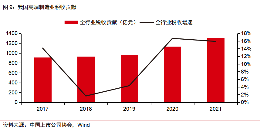 此外,随着收入增长,高端制造业上市公司的税收贡献也在稳步增加。由2017年的914.1亿元,增加至2021年的1311.4亿元,复合增长率为9.4%,低于同期营收的增速,体现了我国对高端制造业的政策支持力度。