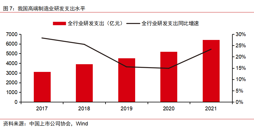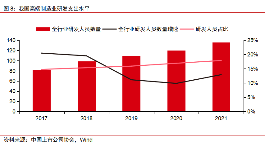 过去5年中,高端制造上市公司研发人员数量由82.5万人快速增长至136万人,复合增长率达13.3%。研发人员占比稳步提升,由2017年14.8%提升至2021年17.9%。研发人员占比的不断提高意味着行业由劳动密集型向人才密集型、科学技术密集型的转变。