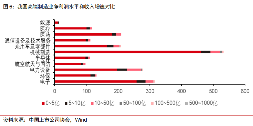 千亿元市值以上公司数量明显增加,截至报告期内,高端制造行业上市公司达千亿元以上的有34家,其中,电力设备及新能源、半导体板块分别由0家增加至15家和6家;电子、机械制造、医药、医疗分别由1/2/2/0家增至4/4/4/3家,均实现了数倍的增长。行业龙头的快速涌现,代表着我国高端制造业在上述细分领域竞争力和话语权的不断增强。