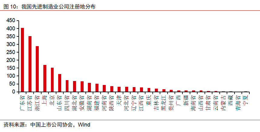 四是产业布局呈明显聚集态势。目前,高端制造业上市公司主要分布在京津冀、长三角和珠三角地区。其中,京津冀地区主要包括了半导体、能源和医疗设备等行业;长三角地区主要包括新能源、电子、医疗、半导体和机械制造等行业;珠三角地区主要包括电子、新能源、医疗设备和机械制造等行业。另外,合肥、成都和西安等城市通过自身的政策和历史的产业布局,在形成自身独特的产业集群。