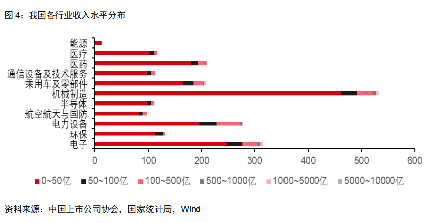 一是市值增长显著,行业龙头涌现。2017年以来,高端制造业上市公司的市值表现优异,100亿元市值以上公司由2017年底的338家增加到报告期内的664家,其中半导体、电力设备及新能源版块增长最为明显,分别实现357%和135.8%的增长。
