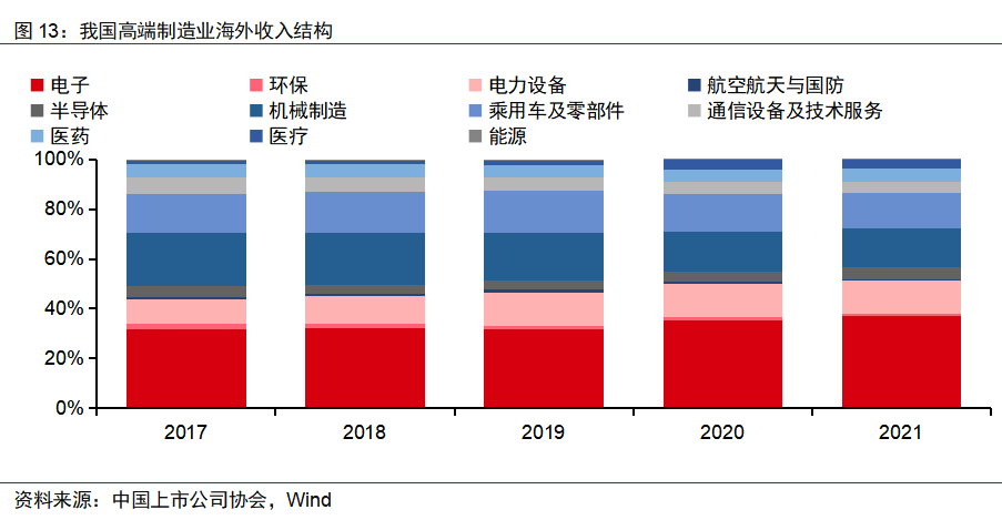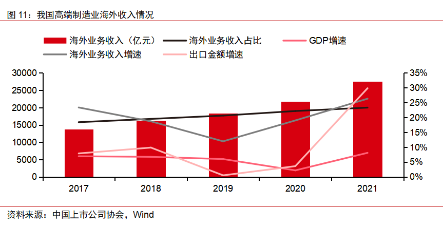 五是海外布局逐渐加速,营收占比持续提升。我国高端制造业上市公司在过去几年海外布局逐渐加速,海外业务收入占比持续快速提升。海外业务贡献总收入由2017年的13.77万亿元提升至2021年27.51万亿元,实现收入翻倍;收入比例逐渐提升,截至2021年,23%的营业收入由海外业务贡献。