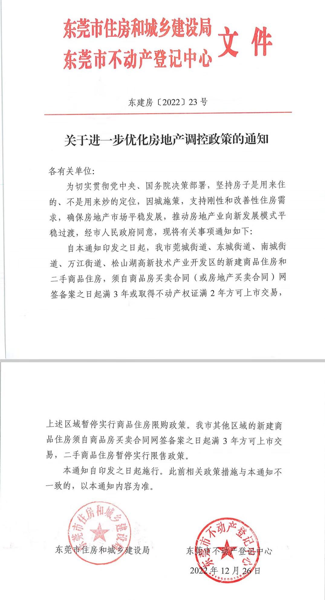 12月26日,东莞市住房和城乡建设局官网发布《关于进一步优化房地产调控政策的通知》称,自通知印发之日(12月26日)起,东莞市莞城街道、东城街道、南城街道、万江街道、松山湖高新技术产业开发区的新建商品住房和二手商品住房,须自商品房买卖合同(或房地产买卖合同)网签备案之日起满3年或取得不动产权证满2年方可上市交易,上述区域暂停实行商品住房限购政策。东莞市其他区域的新建商品住房须自商品房买卖合同网签备案之日起满3年方可上市交易,二手商品住房暂停实行限售政策。