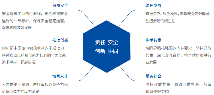 ESG理念体系惠及各方。中国核电秉持“责任、安全、创新、协同”的核心价值观,将ESG理念全面融入日常经营管理,深植于安全、环境、创新、协同、员工、社会六大实质性议题中,形成惠及各方的ESG理念体系,促进经济、环境、社会协调发展。