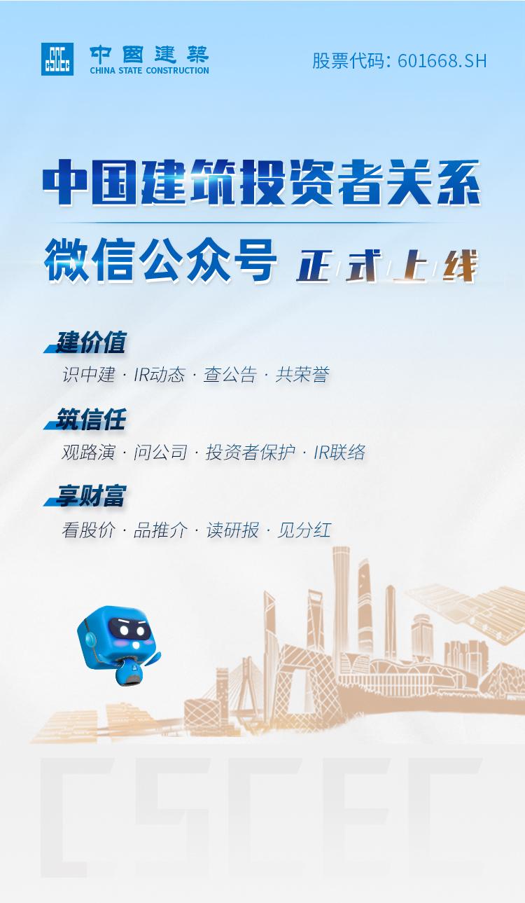 2.在投资者权益保护方面,坚持信息合规披露,持续提升信息披露质量,发布国际版定期报告。创新业绩推介方式,首次采取线上业绩说明会形式,2.4万人次在线参与,主动组织分析师、投资者开展交流。新设“中国建筑投资者关系”公众号平台,借助新媒体渠道助力投资者保护工作。