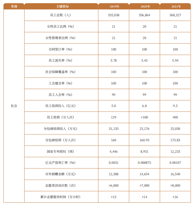 上市以来,公司主要业绩指标保持了中高速增长,盈利能力稳定,企业价值不断得到提高。2021年,公司完成营业收入1.89万亿元,实现归属于上市公司股东的净利润514亿元,基本每股收益1.25元。公司上市13年来,新签合同额、营业收入、归母净利润年均复合增长率均超15%,净资产收益率ROE持续稳定在15%左右高位区间,是A股十年间少有的ROE年均增速维持在15%左右的公司。公司做好ESG管理工作,正是超越自我、持续突破的价值创造集中表现。