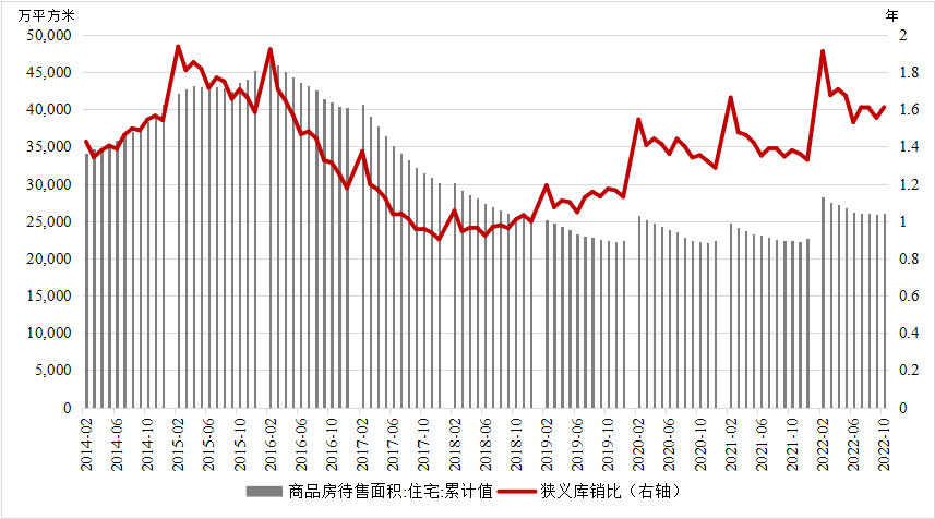 一是狭义住宅库存及狭义库销比均较快增长。狭义住宅库存指商品住宅待售面积,该指标是房地产开发企业报告期末已竣工的可供销售或出租的商品房屋建筑面积中,尚未销售或出租的商品房屋建筑面积。由于商品住宅待售面积计入的是已竣工的建筑面积,因此对应除以过去12个月住宅销售面积中的现房面积,作为狭义住宅库销比。截至2022年10月,我国商品住宅待售面积2.6亿平方米,较去年同期增长16.6%,且今年以来同比保持10%以上增长,表明商品住宅库存水平较上年明显增加。截至2022年10月狭义库销比为1.61年,意味着商品住宅现房出清周期约为19.3个月,较上年同期提高2.8个月。