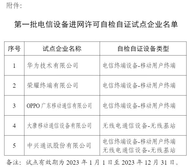 为贯彻党的二十大关于深化“放管服”改革的决策部署,落实《国务院办公厅关于深化电子电器行业管理制度改革的意见》(国办发〔2022〕31号)有关要求,进一步推动电信设备产业高质量发展,依据《工业和信息化部关于开展电信设备进网许可自检自证试点工作的通告》(工信部信管函〔2022〕273号),经企业申报、材料审查和专家评审,确定华为技术有限公司等5家企业为第一批电信设备进网许可自检自证试点企业(见附件),现予公布。