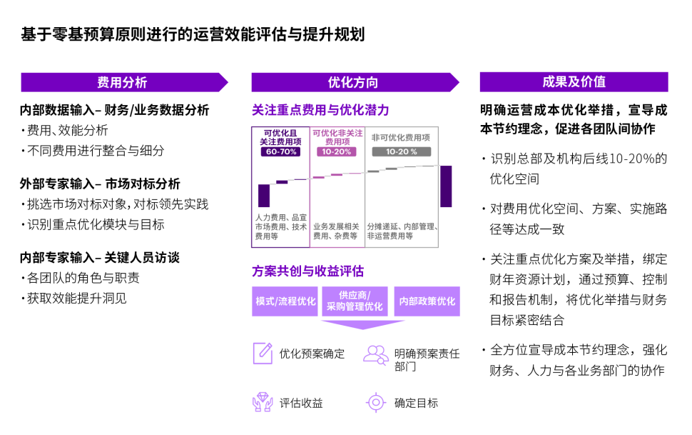 从方法上说,公司首先需要透视成本全景,识别重点管控领域,通过内部专家访谈、外部先进对标分析以及内部财务/业务数据分析,自上而下明确不同职能中心的降本增效潜力与重点范围。