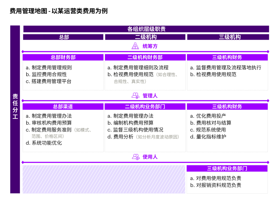 根据业务及管理费用细分特点,明确费用部门,清晰界定统等、管理与使用职能,减少费用管理的灰色边界,形成完善的企业费用管理地图。