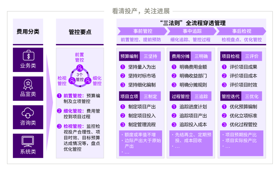 由此,险企需要明确不同成本的事前、事中、事后阶段,并采取不同的费用管控方法。以专项类成本为例,险企应围绕三个管控要点,开展“三法则”全流程穿透管理:事前管控明确金额、投产、管理部门及流程;事中监控计划进度、阶段产出、成本投入;事后评价成果、时效、投产效益,并持续迭代优化管理规则,建立精细化专项成本的全周期管理方法。