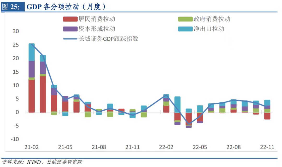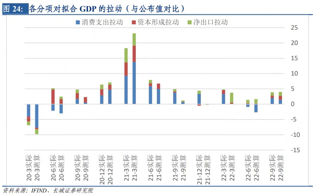 本文计算出的月度GDP同比(下文称为“GDP拟合值2”)与《长城证券中国经济活动指数》中的方法的测算值(下文称为“GDP拟合值1”)有一定差异。但本篇我们重点想确定月度GDP各分项对其拉动,因此我们在本文方法初步确定各个分项对GDP的拉动后,将其带入GDP拟合值1进行调整,最后得到最终GDP各分项的拉动值。今年11月份,消费支出、资本形成和净出口分别拉动GDP增长-1%、1.2%和1.6% 。