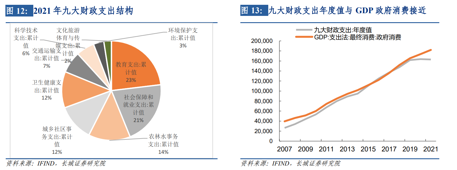 当前财政部公布一般公共预算支出情况,主要支出科目包含教育、科学技术、文化体育与传媒、社会保障和就业、医疗卫生与计划生育、节能环保、城乡社区事务、农林水事务、债务付息支出这十项。我们将前九项作为经常性业务支出的代表,九大财政支出年度值与GDP政府消费值除个别年份存在较大差别,其余大部分时间基本一致。以上财政支出项目每月公布,我们结合该数据,剔除CPI服务价格,也可以较好刻画每月政府消费同比增速。