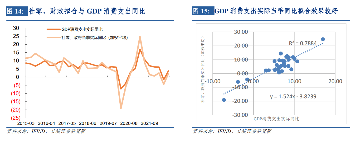 分别用社零-CPI同比、九项财政支出-CPI服务同比代替居民消费和政府消费支出实际增速,加权平均后与GDP消费支出实际当季同比较为一致。
