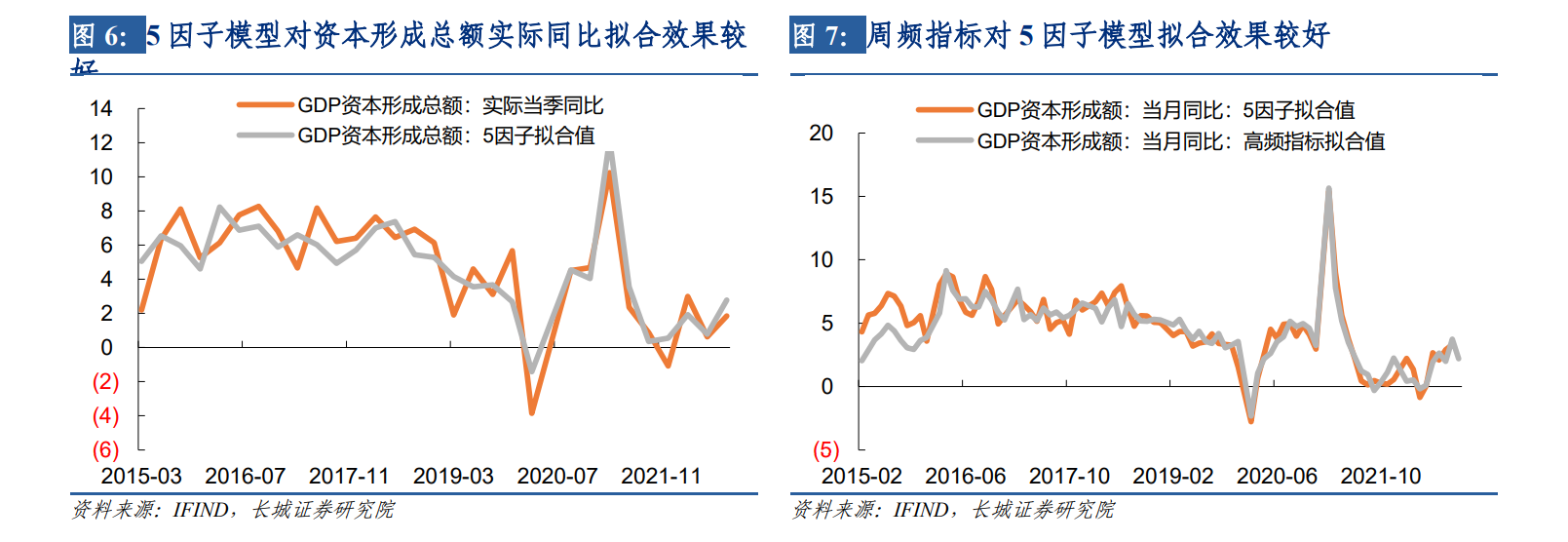在之前的名义资本形成额同比拟合模型中,我们选定两大重点行业——制造业、基础设施建设业,其他部分以PPI生产资料同比进行近似替代。我们在原先的三因子模型的基础上扣除了PPI生产资料同比增速,而添加了房地产投资、土地购置费、商品房销售额三个因子。从2015年以来的数据看,5因子模型[2]对实际资本形成额同比增速有较好的拟合效果,调整后R方值达到0.71。以上5个自变量均为国家统计局每月公布,我们可以对每月的实际资本形成额实现跟踪拟合。