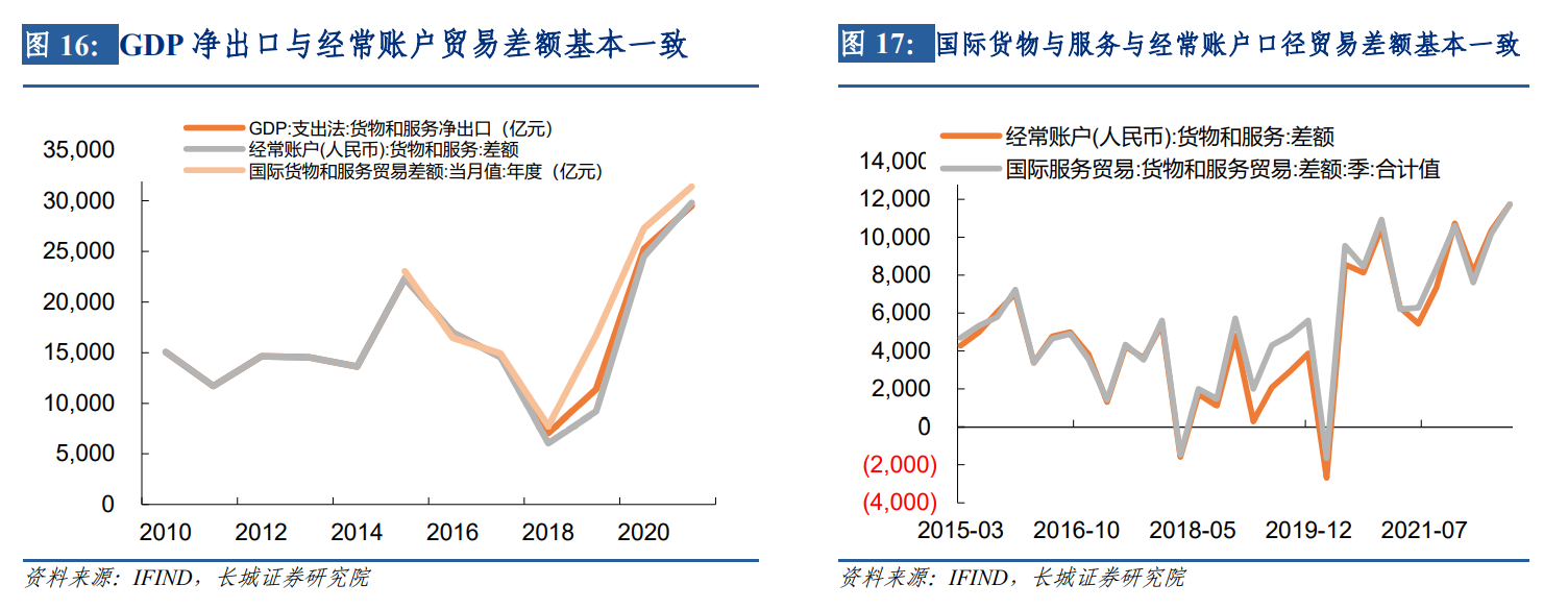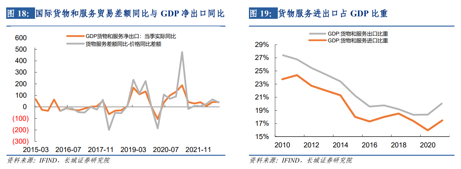 从历史数据来看,GDP货物和服务净出口与国家外汇管理局公布的国际收支平衡表中经常账户的货物和服务差额基本一致,这一指标每季度公布一次。另外,外汇管理局也公布我国的国际收支:货物和服务贸易数据,从2015年开始每月公布一次,其与经常账户口径的货物和服务差额基本一致,只有部分时段存在一定差异。GDP净出口实际增速可以通过拉动值倒推,我们用国际货物和服务贸易差额季度同比剔除价格因素[4]两者走势较为接近。近十年来,货物与服务净出口占GDP的比重维持在3%以下,价格因素对GDP增速的影响基本可以忽略不计。